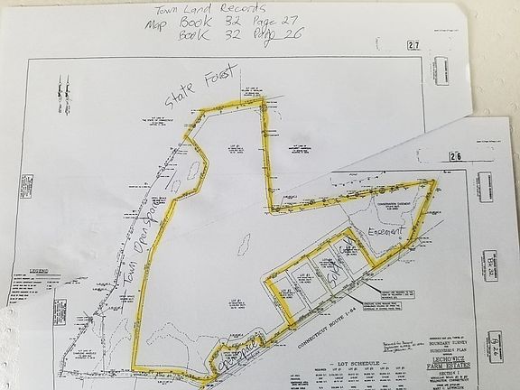 55.79 acres, lot 1 of an approved subdivision, January 2006 including survey, soils testing and recorded engineer's conceptual site plan. Abuts over 900 acres of state forests. Present annual property tax of $1.025 reflects present assessment as a 1.85 acre house lot and remaining 53.2 acres in PA 490 Forest; taxes on remaining 53 acres is $272 per year. It is up to the next owner if they wish to classify as 1 house site plus forest. Wetlands delineated by soils scientist and mapped out by surveyor. Non wetland soils is 50,52 acres. In late 2006 was approved for 15 house lots with a road, but the road was never built, so after 10 years the subdivision expired. 15 perc tests and 30 deep holes approved for 15 building sites if you wish to chose another house location. Google says 18 minutes to UCONN, 26 to Hartford and 38 to Worcester. The road frontage at the proposed building site starts 420' south of house 109 Mihaliak Rd (on lot 4) or about 440' north of Mihaliak Rd Ext intersection.