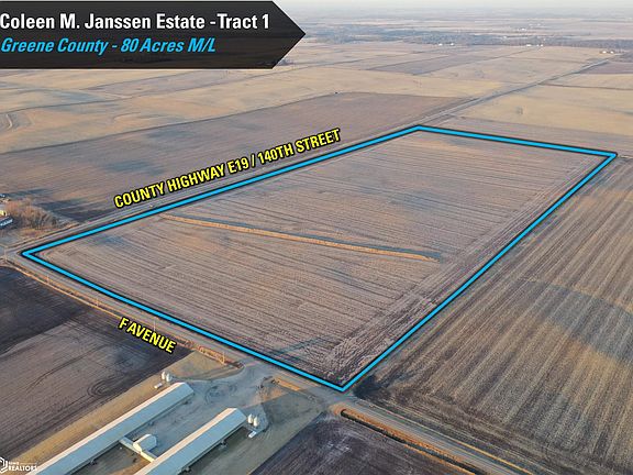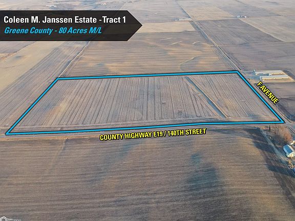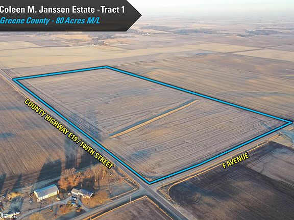 Greene County, Iowa Farmland Auction - April 3, 2025 at 10AM! Tract 1 includes 80 acres m/l with an estimated 74.83 FSA tillable acres and a CSR2 soil rating of 87.5, well above the Greene County, Iowa average CSR2 soil rating of 78.3. Of the cropland acres, 74.25 are currently farmed with the balance being a grass buffer strip. The primary soil types include Nicollet clay loam, Clarion loam, and Webster clay loam. The farmland is classified as Non-Highly Erodible Land (NHEL). Tract 1 adjoins Tract 2 and they have previously been farmed together. Access is from the east off F Avenue. There are 10" County drainage tile lines located on the western half of the tract with water flowing south off the farm, as well as three tile intakes, see the 'Tile Map' for more details and approximate locations. The farm is leased for the 2025 growing season and an estimated rent credit of $22,275 ($300/acre) will be given at closing, contact the listing agent for more information.