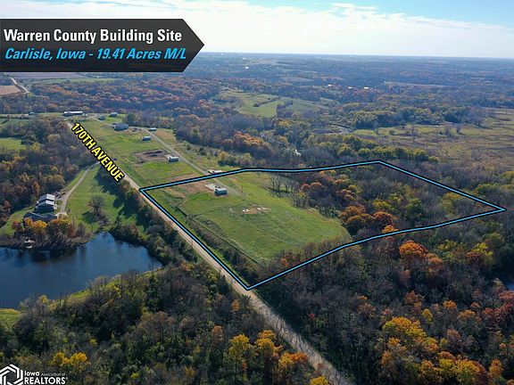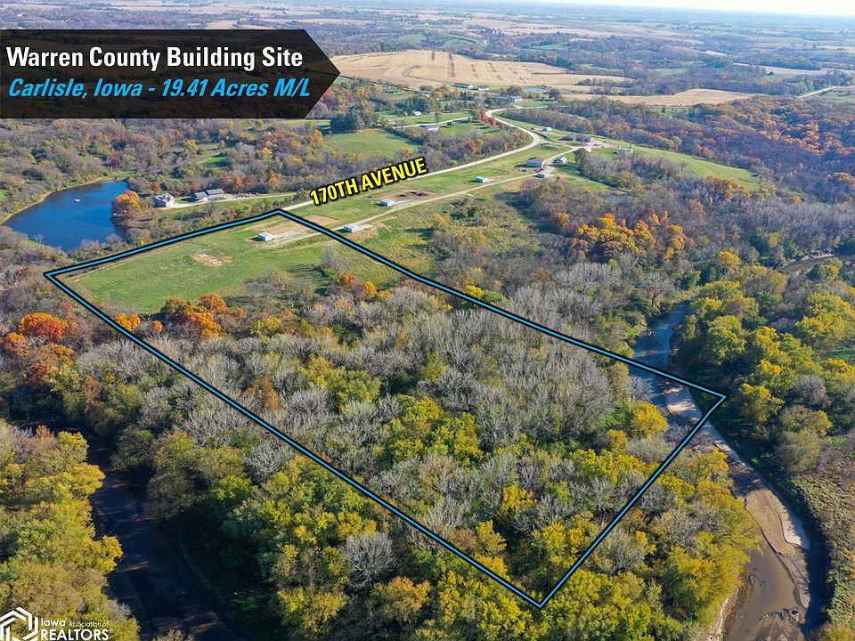 Tract 1 consists of 19.41 surveyed acres m/l with road frontage on the east side along 170th Avenue. This tract features both pasture and timber, making it an ideal location for a home within the Carlisle Community School District. The Middle River flows just north and west of the property, providing a natural water source for wildlife and excellent recreation opportunities. These 19.41 acres feature a pole barn with a concrete floor and pasture acres for livestock opportunities. Located within the pasture are two concrete pads that were used for portable sheds. The portable sheds have been removed, but an automatic livestock waterer remains. The Warren Water District waterline ends approximately 380 feet south of the Tract 1 property boundary. A water study has been completed that approved the installation of a meter pit on the property, at the buyer's expense. An 80-foot Utility Easement was included on the Tract 2 survey, allowing an incoming buyer to extend the existing waterline onto Tract 1. Buyers are responsible for their own due diligence regarding confirmation and pricing. Electricity is provided by MidAmerican Energy along the west side of 170th Avenue. Buyers should confirm the requirements and costs for connecting electrical service. Buyers are responsible for installing a driveway for access to the tract. Driveway placement and permitting are subject to approval by the Warren County Secondary Roads Department.
