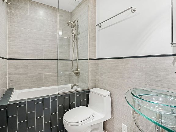 The oversized bedroom accommodates a king-size bed and includes a generous closet with custom built-ins for optimal storage. The bathroom is finished with light gray tiling, a soaking tub, and a mirrored medicine cabinet. For everyday convenience, enjoy the in-unit washer and dryer.