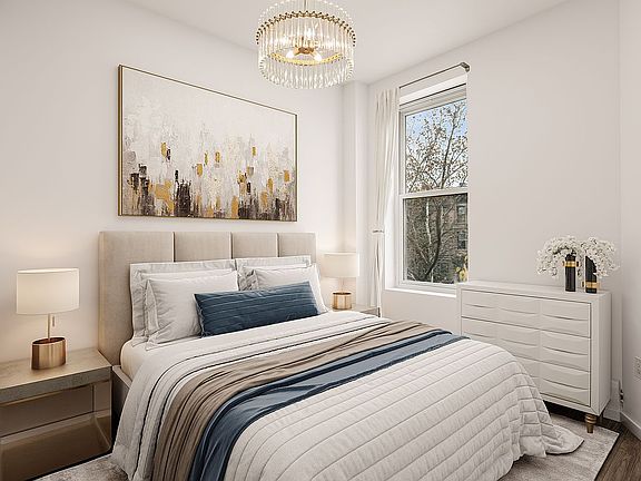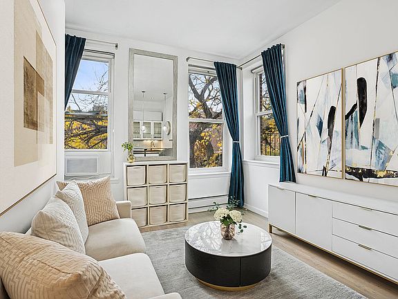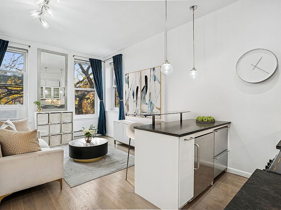Residence seven is a bright and elevated one-bedroom, one-bathroom corner home, perfectly situated on a quiet, tree-lined block in the heart of Carroll Gardens. With four oversized windows—south- and west-facing—high ceilings, and serene treetop views, the space is flooded with natural light throughout the day, creating the feeling of a modern, tranquil treehouse.
