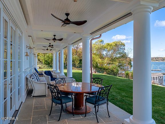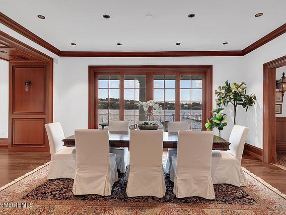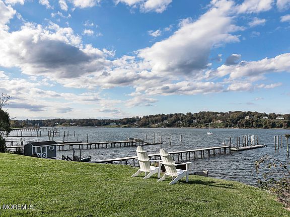 Experience unparalleled luxury and lifestyle in this extraordinary waterfront residence, perfectly positioned high and dry with a coveted riparian grant and deep-water dock. Set against an expansive backdrop of river views and unmatched privacy, this home has been completely reimagined by the current owner to offer three levels of refined living where no detail has been overlooked. The modern, open floor plan is bathed in natural light and designed for versatility, showcasing soaring ceilings and panoramic views from nearly every room. Exquisite custom finishes define the interior—mahogany raised-panel millwork, wide-plank hardwood floors, coffered ceilings, and radiant heat throughout. At the heart of the home lies the ultimate entertainer's kitchen, featuring a large island with counter seating, commercial-grade appliances, a walk-in pantry, and custom cabinetry. The adjacent family room, anchored by a striking brick and stone fireplace, offers warmth and sophistication in equal measure. Retreat to the lavish primary suite, where a custom coffered ceiling, a spacious walk-in closet with built-ins, and a spa-inspired bath with glass-enclosed shower, dual vanities, soaking tub, and sauna create a private sanctuary. Additional bedrooms boast sweeping river views, generous closets, and magazine-worthy baths with top-tier appointments. The third floor is a showstoppercomplete with a wet bar, office, guest accommodations with two full baths, and an expansive riverfront terrace featuring ample seating and a wood-fired pizza oventhe ultimate venue for entertaining. Further highlights include a bonus game room, media room, custom mudroom with built-ins, and a spectacular lower-level wine cellar with tasting area and exposed brick detailing. Truly, no amenity has been spared. Set just moments from downtown Rumson's boutiques and restaurants, and only minutes to the NYC ferry, this property represents the pinnacle of waterfront living. A rare opportunity, simply a must-see.