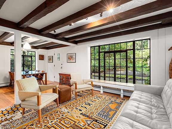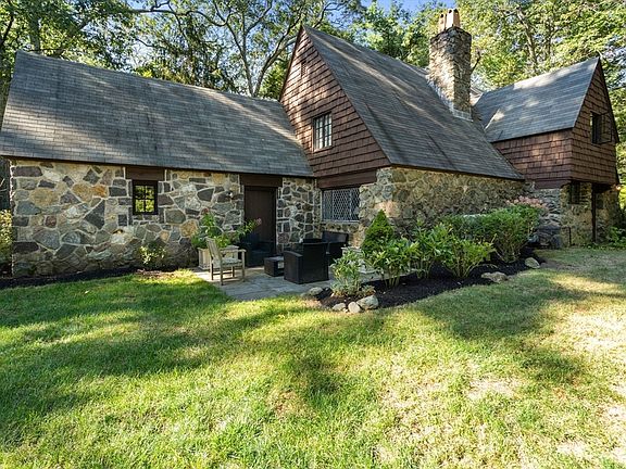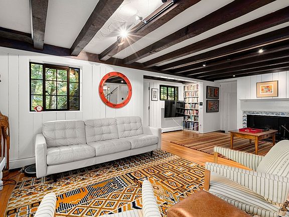 This inviting Cotswold style home is sited beautifully on app. .6 acres of land with mature plantings and lots of open grass and seating areas and a detached 2 car garage. The first floor offers: beamed ceilings, a fireplace with delft tile surround, a living area with seating and dining opens to a chef's kitchen with Brazilian granite, maple cabinets and stainless appliances. Additionally on this level is a wing with a separate entrance that includes two offices or an office and a bedroom with a built-in murphy bed and a laundry. The second floor has an expansive primary with vaulted ceilings and rows of closets, access to a bathroom and additional storage, an ensuite bedroom and a third bedroom/sitting room. Enjoy flexible living with great spaces for in-home offices, built-in murphy bed, a separate entrance and an open living area. Conservation land and the bike path to town are just a few hundred feet away from this house, 2024 new heat pump for a/c on second fl.and office.