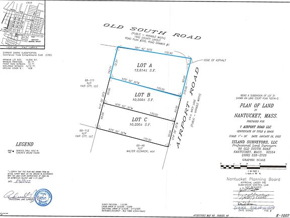 Prime, versatile commercial/residential corner lot at the intersection of Airport Road and Old South Road. This highly visible 13,814 +/- sq ft parcel (Lot A) sits just west of Nantucket Memorial Airport and offers outstanding frontage on two of the island’s busiest roadways. Located within the flexible CTEC zoning district, the property supports a broad range of commercial and residential uses, including mixed-use development, contractor/shop space, offices, or residential units (see use chart). Town water and sewer are available, providing added convenience for future development. With exceptional exposure and placement in a high-traffic corridor, this lot offers an excellent opportunity for businesses or investors seeking a strong, year-round presence. May also be purchased together with 1 Airport Road, Lot B (see Listing #92741).