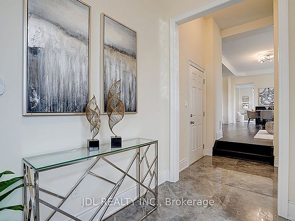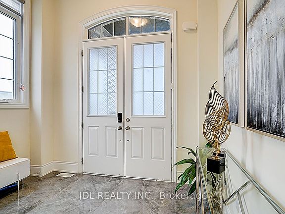 Welcome to this spectacular 6-year new detached home, perfectly situated on a premium corner lot in one of Pattersons most coveted neighborhoods. Designed with modern upgrades and timeless elegance, this residence offers a harmonious blend of comfort, style, and functionality. Step into a grand foyer with double-entry doors and sleek porcelain floors that set the tone for the homes sophisticated design. Boasting 10-ft ceilings on the main floor, 9-ft ceilings upstairs and in the basement, and an airy open-concept layout, the home is filled with natural light throughout. The main floor office impresses with soaring 11-ft ceilings, while the elegant living and dining room features a double-sided gas fireplace, creating a warm and inviting atmosphere. The heart of the home is the modern custom kitchen, all upgraded to built-in JennAir appliances, stone countertops, a center island with breakfast bar, and a spacious eat-in area that opens to the backyard. An adjoining family room with a coffered ceiling and southeast exposure provides the perfect space for gatherings, enhanced by pot lights and rich 5" Eng hardwood floors throughout. Upstairs, this family-friendly home offers 4 spacious bedrooms and 3 full bathrooms, including a primary retreat with a 5-piece spa-inspired ensuite featuring an oversized seamless glass shower, double vanities, and sleek porcelain finishes. Convenient 2nd floor laundry adds modern practicality. The finished basement extends the living space with a large recreation room, an additional bedroom, and a sound-proofed Karaoke room, ideal for family fun and entertainment. Located steps from parks, scenic trails, boutique plazas, and directly across from Eagles Nest Golf Club. Just 5 minutes to Maple GO (ideal for commuters), Mackenzie Health Hospital, St. Theresa of Lisieux Catholic HS, Alexander Mackenzie HS, and major highways.