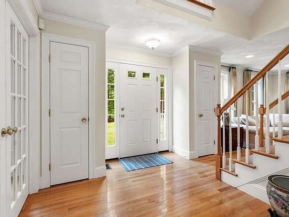 Welcome to Ash lane. A stately Center Entrance colonial beautifully sited on a knoll at the end of a winding drive abutting conservation & the Parker River. Gracious two story wrap around entry foyer leads to an interior open floor plan. Over sized eat in kitchen features granite counters, SS appliances & sliders to a deck overlooking acres of wooded backdrop. The airiness continues with a open dining room and livingroom. Elegance abounds with wainscoting and crown moldings throughout. A family room with gas fireplace, large mantle and private office with French doors complete the first floor. 4 generous sized bedrooms flow from the 2nd floor central foyer & balcony including a nicely set off hallway to a primary suite. The large primary BR features a gorgeous bathroom, including whirlpool soaking tub, double vanity, separate granite slab shower and walk in closet. Plenty additional storage or potential additional living area in walk up attic and on grade LL rough plumbed & wired.