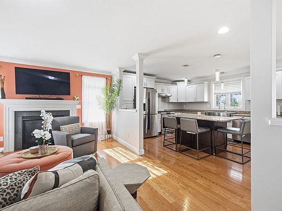 Custom-mantled fireplaceCentral airModern finishesClassic new england styleOpen-concept layoutGleaming hardwood floorsQuartz countertops