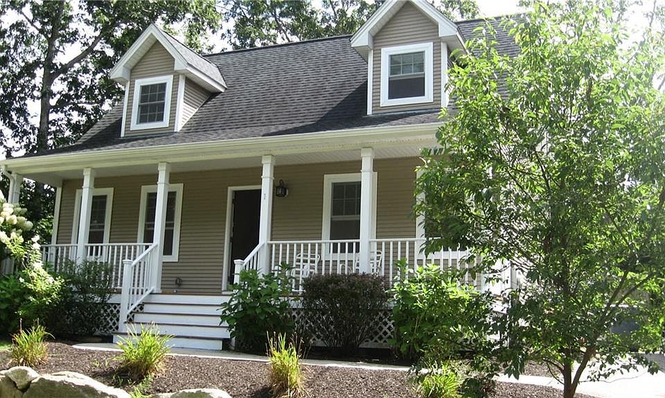 Like new, 12 year old farmers porch Cape, on a quiet tucked away cul-de-sac, in the Fieldstone Estates neighborhood. Home was completely remodeled in 2020-2022. This home boast living room with gas fireplace with tile surround, formal dining room, new kitchen cabinets with granite counter tops, 8 foot island, and a coffee bar, new bathrooms with all updated fixtures and tiled shower, gleaming hardwood floors, new lighting fixtures throughout, front to back 25' master bedroom with walk-in closet, central air, and first floor laundry room. 4 Seasons room open to living room and sun deck over looks expansive custom fenced in rear yard with new professionally designed landscaping. 20x 22 garage with 10 foot walls and paved driveway. Full basement with bulkhead walk out. Rural, country setting, with the convenience of a 10 minute drive to local beaches, and revitalized downtown Westerly.