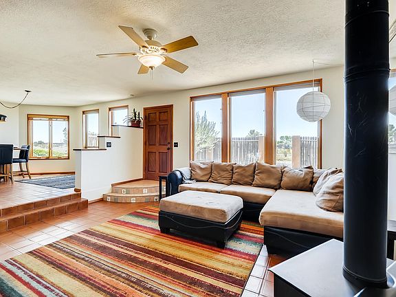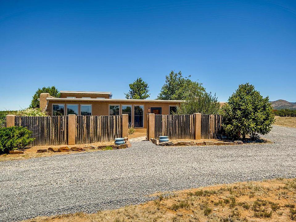 Handsome and extra bright 3 bed/2 bath single level passive solar Eldorado special on quiet cul de sac location! X-wide neat kitchen has direct access to back flagstone patio and coyote fenced yard w/hot tub and also flows to separate dining area & South facing sunken living room w/sunplashed wall of windows & wood stove. Master suite has vaulted ceiling, access to West facing side patio w/forever views, and double vanity+jacuzzi tub/shower combo bathroom with generous walk in closet. Incredible 28 panel solar system to take advantage of, dramatic circular driveway to fit many vehicles in addition to 1 car garage + 2 car parking pad, multiple rain barrels, irrigation system, private well, new water heater (2019), all 3 bedrooms have walk in closets, and home is adjacent to 2 vacant lots & thus feels very private. All of this plus the copious amenities Eldorado has to offer (athletic facilities, walking/biking paths, community center, dog park, greenbelt, horse facilities, etc) within 30 mins of the Plaza.