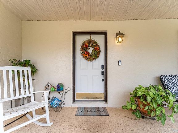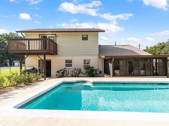 Beautiful, MOVE-IN READY 4/2 POOL home with DEN on a corner lot with fenced back yard. Lovely screened front porch with porch swing.  Primary bedroom is on the first floor with 3 bedrooms/1 bathroom upstairs.  Bedroom 2 has glass sliders with a balcony.  Granite countertops in kitchen.  Refrigerator 2023, range 2022, microwave 2024, washer/dryer 2024.  Dining room has glass sliders to patio outside. Awesome back porch/sun room to enjoy this cooler weather!  Gorgeous in-ground pool for fun on sunny days!  10x16 storage shed with 2 inside lofts for extra storage.  Great location - approx 2 miles to Walmart, Publix, Aldi. Don't miss this one!  ROOF 11/2024. HVAC 2021.  SELLER OFFERING $2000 IN CONCESSIONS at closing to replace carpet.