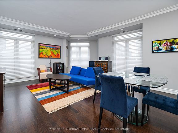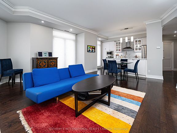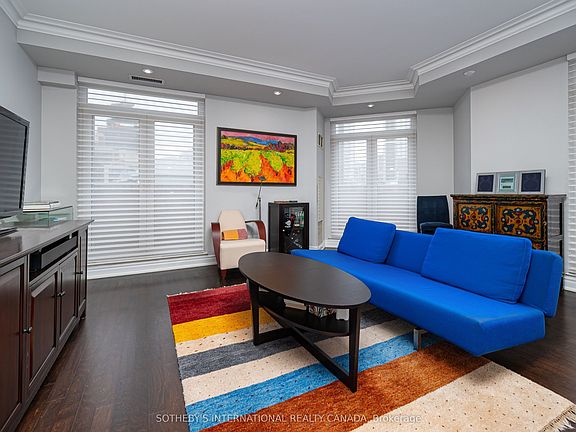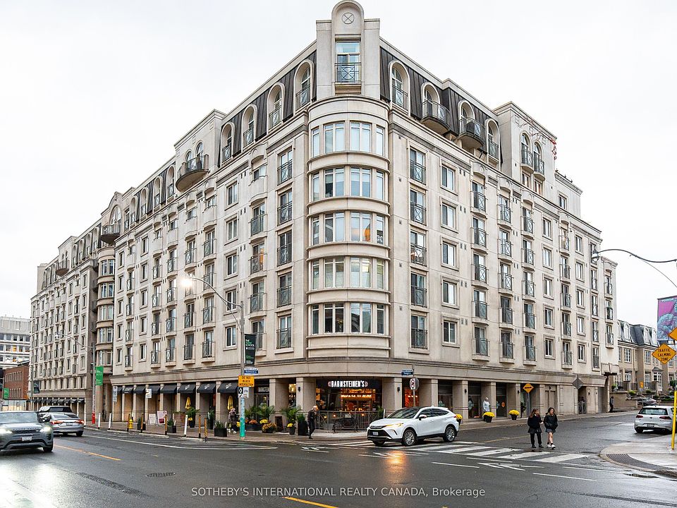 Distinctly, One of One. Suite 803 is a sub-penthouse that offers all the hallmarks of fine living. 9-foot smooth ceilings throughout accented by crown mouldings, gallery-quality wall space, and floor-to-ceiling French doors that flood every living space with natural light through custom Hunter Douglas blinds. Hardwood flooring and solid wood Shaker doors throughout exude quality.The inviting foyer leads to the open concept living and dining rooms and a Chef-inspired kitchen with exquisite marble counters and curated appliances. The expansive primary bedroom easily supports a king-sized suite of furniture and features 3 double built-in custom closets. A sumptuous 4-piece primary ensuite features a mosaic tile floor, a large shower enclosure and classic double vanity with marble top. The spacious and inviting 2nd bedroom has a large double closet and could serve as your home office and den. The luxury continues with the main bath featuring an immersion tub with a rain shower, a large vanity and additional storage cabinet. All 6 floor-to-ceiling French doors provide access to 3 balconies that wrap this beautiful corner suite. This extraordinary living space comes with 2 deeded parking spaces that are just steps from a large, exclusive use locker. 1 Balmoral Avenue is a mid-rise building of only 133 suites with impeccable property management, a dedicated, long-serving Concierge team and support staff. 40 visitor parking spaces and 2 guest suites ensure your guests are comfortably accommodated. *Status Certificate is available*.