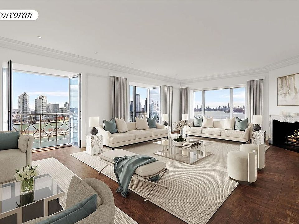 The elegant primary suite offers direct East River views and features an expansive dressing area, a walk-in closet, and a jewelry closet. The spa-like en-suite bathroom includes dual sinks, a soaking tub, and a separate shower. Two well-proportioned additional bedrooms, one with direct terrace access, share a spacious windowed bathroom with double sinks.
