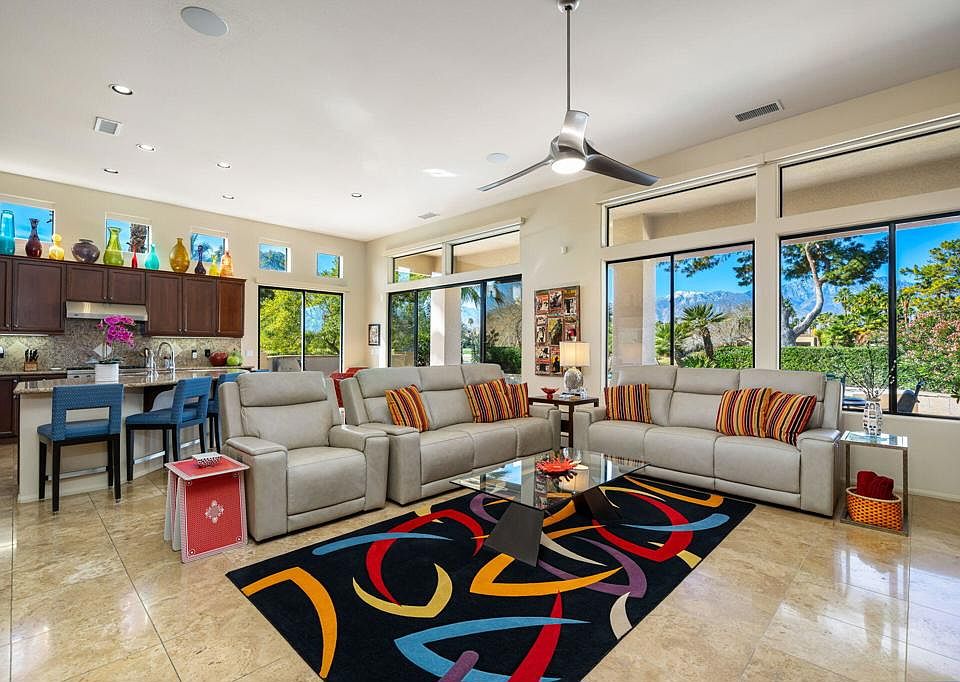 Nestled on a premium west-facing lot on the 13th tee of the Pete Dye Course, this beautifully upgraded and meticulously maintained home offers breathtaking mountain views and resort-style living. Enjoy outdoor living at its finest with a Pebble Tec saltwater pool featuring a stacked stone spillway, elevated spa, fire pit, crystal lighting stones, and a chef's outdoor kitchen--all adjacent to a covered patio, perfect for entertaining. Inside, the gourmet kitchen boasts a Viking cooktop, Sub-Zero refrigerator, wine cooler, center island, and rich dark cherry cabinetry. A dramatic triple-sided glass fireplace separates the living and great rooms, which also feature a built-in entertainment center and high-tech sound system. Electric shades in the kitchen and great room make managing sunlight effortless. The spacious primary suite includes a cozy fireplace, walk-in closet, and spa-like bath with jacuzzi tub. A private guest suite offers its own outdoor patio and ensuite bath, while a third ensuite bedroom functions as a stylish office with built-in desk and workspace. Additional highlights include: Leased Solar, Tankless water heater, Full home water filtration system, low HOA that includes a social and fitness membership to Mission Hills. Call for your private showing today!
