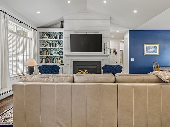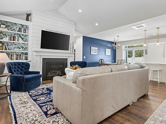 Welcome to this pristine home designed for easy, one-level living with thoughtful custom details throughout. The main living area is light-filled and inviting, featuring vaulted ceilings, a cozy fireplace with nickel gap accent wall, and a built-in bookcase that adds both charm and function. The open kitchen is the heart of the home, offering a generous island, Thermador appliances, and seamless flow into the dining area. From here, step out onto the deck and down to a spacious private patio—perfect for summer gatherings, morning coffee, or evenings under the stars.