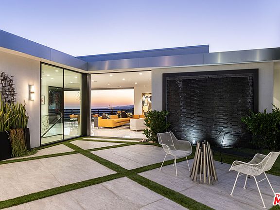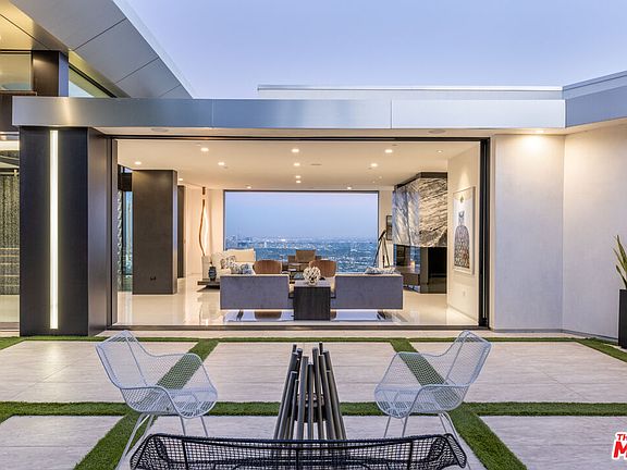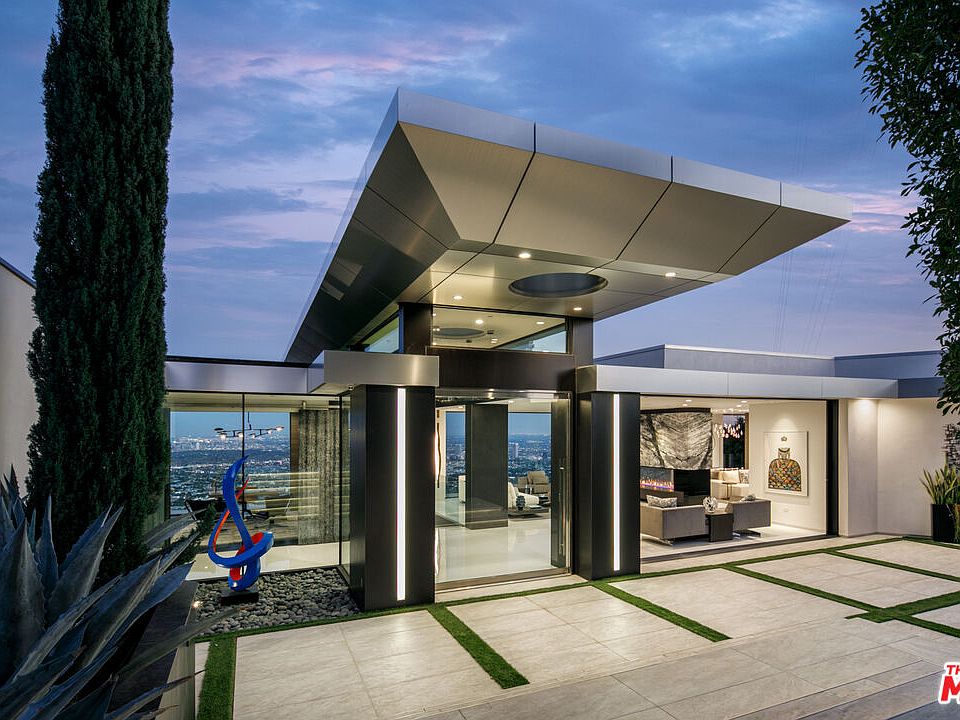 Presenting this immaculate Hollywood Hills contemporary promising the ultimate luxurious California living, perched above the famed Sunset Strip with jetliner views. Tucked away from the city, the home sits at the end of a private, gated street and is enveloped by explosive vistas from DTLA to the Pacific. The entry is itself a geometric statement piece with modern, cubic columns illuminated and framing the cityscape in the distance. With a sweeping open floor plan and endless indoor/outdoor flow, the compound is a true entertainer's paradise. Each space is beautifully accented by balconies and disappearing walls of glass allowing for you to enjoy the mesmerizing vistas from nearly every room. The kitchen is appointed with sleek, glossy cabinetry, built-in top-of-the-line appliances, Italian granite backsplash, and double islands. Rivaling the most luxurious five-star resorts, the sumptuous primary suite includes a dramatic two-story dressing room and decadent bath with soaking tub, dual showers, and makeup vanity. Additional amenities include library, high-end fitness studio, media room, well-appointed guest suites, three-car showcase garage, and so much more. Relish the beautiful California weather in the outdoor spaces which boast a sparkling infinity-edge pool, sprawling grassy knolls, al-fresco dining areas, and a rooftop sky lounge with a breathtaking panorama view. A work of art in a world-class locale, this gorgeous Hollywood oasis is secluded, yet just moments to the iconic Sunset Strip and prestigious Beverly Hills.