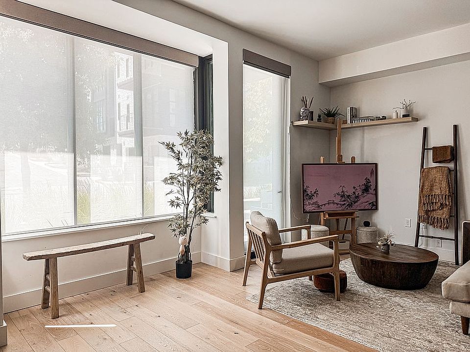 • Automatic dual roller shades (sheer + blackout, smart-home compatible)