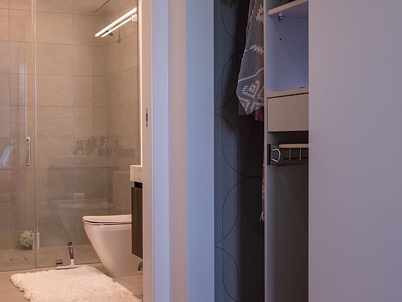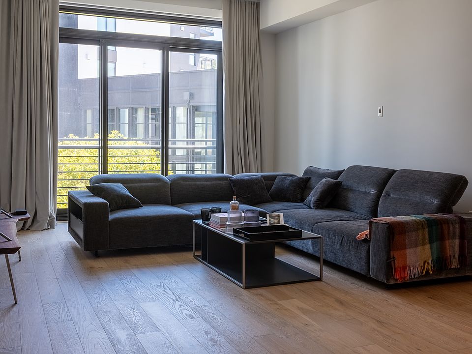 This luxurious 1-bedroom, 1-bath condo (~898 sq ft) features soaring ceilings, floor-to-ceiling windows with custom curtains and automated shades, two custom closets, and wide-plank white oak floors.