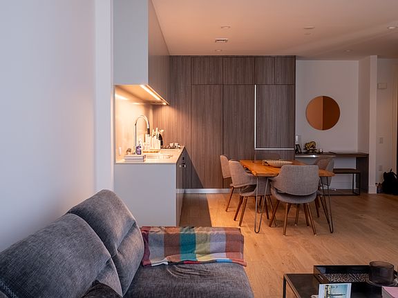 The chef's kitchen boasts Miele appliances, Arclinea cabinetry, and Dornbracht fixtures, while the spa-style bathroom stuns with Carrara marble and a walk-in shower. BoConcept furnishings are included (bed with linens, sofa, coffee table, mirror, and side tables), along with kitchen essentials and in-unit washer/dryer.