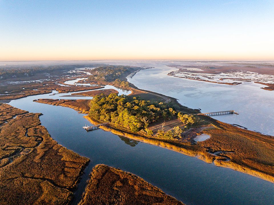 The lush, sun-dappled island itself is shaded by live oaks and other native Island trees, and yet plentiful in open spaces. Golden sunlight slanting through leaves in early morning and evening is paralleled only by sun streaming across the water at sunrise and sunset: both easily visible from the homesite.