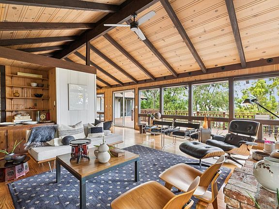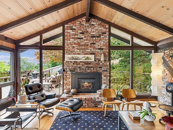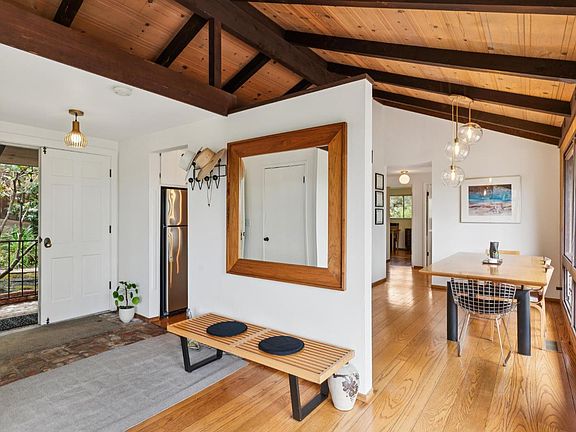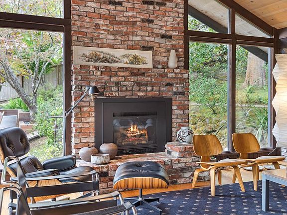 Contemporary mid-century home is perfect for design and nature enthusiasts. Apprx .26 acres with beautiful mature trees nestled on a charming cul-de-sac in the desirable Almonte area of Mill Valley. Easy one floor living with the main living areas, featuring three bedrooms, two full baths, a mudroom w/ laundry and an expansive deck for seamless indoor/outdoor flow. The spacious fourth bedroom and third full bathroom are located downstairs, separate from the main living area with its own entrance, making it an ideal guest suite or studio, etc. The deck spanning the length of the house allows direct access to the fenced yard and gardens with sun/shade throughout the day for relaxation, play, and entertaining. The home boasts fabulous original brickwork and open beam ceilings, with large mid-century style windows and sliding doors that flood the space with light and nature views. New heat pump and HVAC add central air/heat. Ample parking with a long driveway, two-car covered carport w/ Tesla E/V station, and a second driveway below the primary one. And there's plenty of storage in the basement areas. This is where an easy stroll or bike ride brings you to Tam High, bike paths, parks/hiking trails, and nearby Miller Ave or a quick dash to SF.