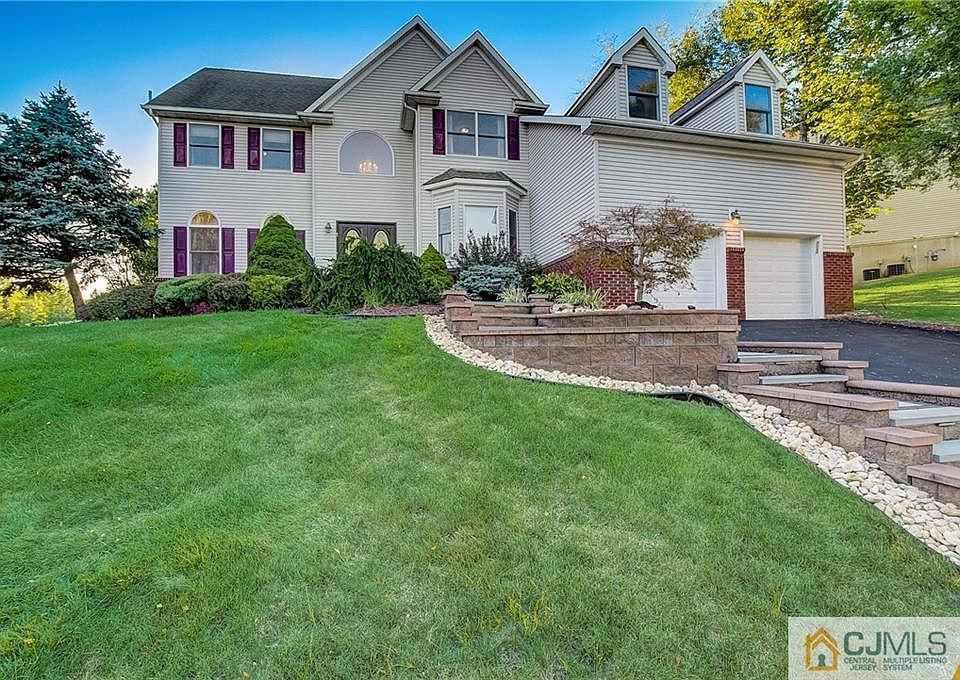 Welcoming hardscaped staircase leads you to entry of this east facing colonial home located in Kingston Hill. Home features 5 bedrooms and 3 full baths with one bedroom and bath on main level. Two story foyer flows into living and dining room both with hardwood floors then onto the kitchen that is open to the great room featuring vaulted ceiling, Brazilian cherry hardwood floors, recessed lighting and a wood burning fireplace. The kitchen offers access to a large paver patio. The primary suite has walk in closet and bath with dual sinks, large shower, soaker tub and separate toilet. There are also three additional bedrooms and hall bathroom on upper level. The full finished basement has high ceilings, recessed lighting and ample space. Princeton Mailing Address with South Brunswick's Award Winning School District. Plus, close to Downtown Princeton, DNR Canal Trail, Train and Bus Services to NYC.