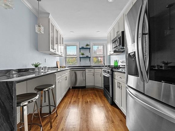 Top floor corner one-bedroom condo with parking, near Forest Hills T. This rare find offers modern updates and a generous layout. The bright, wide galley kitchen boasts sleek LG appliances, ceiling-height cabinetry, black granite counters, and recessed lighting. Sip morning coffee at the dining nook. Spread out in the 200 sq ft living room, spacious for both a dining table and workspace. The 120 sq ft bedroom gleams with corner light. And the refreshed bathroom offers stylish tiling. Interior storage includes three hall and foyer closets. The association is reviewing options to install a new cooling/heating system with in-unit control. In the basement, find private and bike storage, and a laundry room. Park anywhere in the complex with your pass. Surrounded by green space, escape into Franklin Park trails and Arnold Arboretum’s treescape in just half a mile. Blocks to Forest Hills Station, Southwest Corridor bike path and Brassica Kitchen.