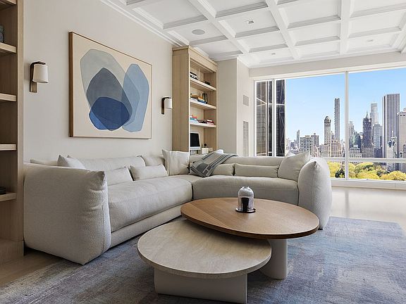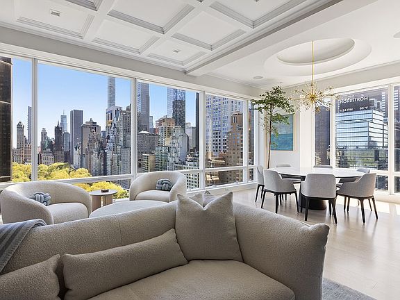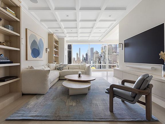 Relax and unwind in the expansive, magazine-worthy living room surrounded by coffered ceilings, wide-plank oak floors and custom white oak built-ins, or plan your next dinner party in the inviting dining room topped by an illuminated cove ceiling and dazzling chandelier. Outside, the dazzling Midtown skyline and Central Park treetops create an unmatched backdrop for lavish entertaining and indulgent daily life. In the work-of-art kitchen, custom gray cabinetry, stone counters and brass hardware flank upscale appliances, including a Bosch dishwasher, Miele built-in coffee system, and a five-burner gas range, wine refrigerator and microwave by Viking. A breakfast counter provides the perfect perch for morning coffee overlooking Columbus Circle.