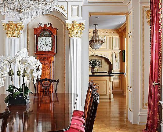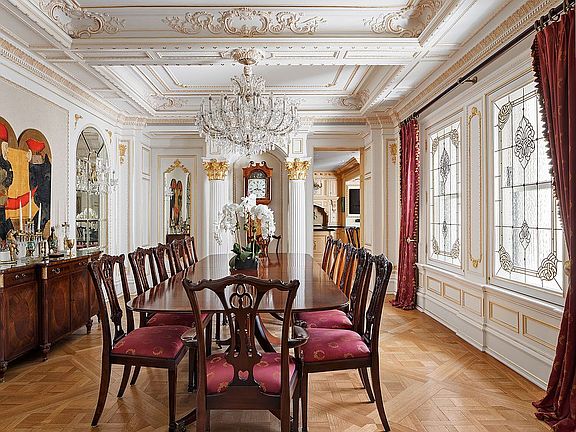 Beyond its visual drama lies a deeply thoughtful infrastructure. The residence features world-class soundproofing, a robust smart home system with integrated lighting, hidden speakers, and AV controls throughout. Every inch of flooring, millwork, and hardware was painstakingly selected to ensure both beauty and performance. The formal dining room is anchored by museum-quality stained glass windows facing south-glowing with light by day and warmth by night-while the chef's kitchen is fully equipped for grand entertaining or daily living, tucked discreetly behind ornate cabinetry.