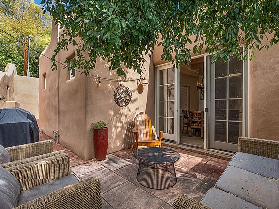Los Perales is a pear tree covered hillside in the historic district, corner of Palace Avenue and Cerro Gordo with three beautiful units designed and built by internationally renowned architect Michael Mahaffey. Great location, wonderful finishes! This lovely Unit B includes two well separated bedrooms and baths that flank the central living areas with gorgeous hand, troweled plaster walls; lovely pickled high, beamed ceilings; tumbled travertine marble baths; private, lovely, entertaining courtyards outside. The intelligent floor plan is elegant and livable! There is plenty of parking and the property is an easy stroll to the plaza, Canyon Road, the river, and the museum District. Walk home in the moonlight in 3 minutes from The Compound, Geronimo, and El Farol!