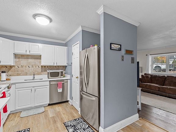 Open layoutEat-in kitchenQuartz countertopsNewer appliancesQuartz-top dining areaTiled backsplashCrown molding
