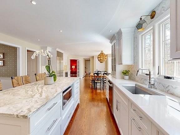 Exquisite custom Colonial home showcasing over 5,000 square feet of sophisticated living space in a scenic and desirable cul de sac neighborhood. This captivating home features high-end millwork and exceptional finishes. The fabulously appointed, gourmet kitchen features Viking stainless appliances, custom cabinetry, and quartz and quartzite countertops. The kitchen seamlessly flows into the expansive and impeccable fireplaced family room. Take in the entertainment-sized dining and living rooms, the enviable laundry room, and half-bath. Step through the sliding French door to access the deck, custom patio and fire pit. Relax in the private, peaceful, and manicured 1.3 acre lot. Ascend the central staircase to the four gorgeous and spacious bedrooms and three renovated bathrooms. The primary suite is a true retreat with its spa-like features. Additionally, there is a large bonus room on this level, offering versatile living/working space. The walkout lower level is beautifully finished.