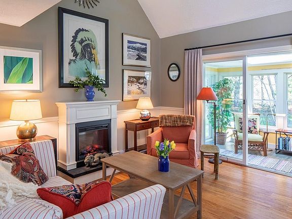 This perfectly situated end unit condominium is beautiful and loaded with wonderful amenities! Enjoy the private and peaceful views of the back yard from your patio or four season sunroom. The cathedral ceiling in the living room creates a wonderfully spacious atmosphere, crowned by the hearth and electric fireplace. Two spacious bedrooms, with another sun filled bonus room over the garage and an office space in the loft. Wake up to beautifully renovated bathrooms! Keep your car protected in the 1 car garage. Privacy abounds at this conveniently located home. A must see. This won't last long!
