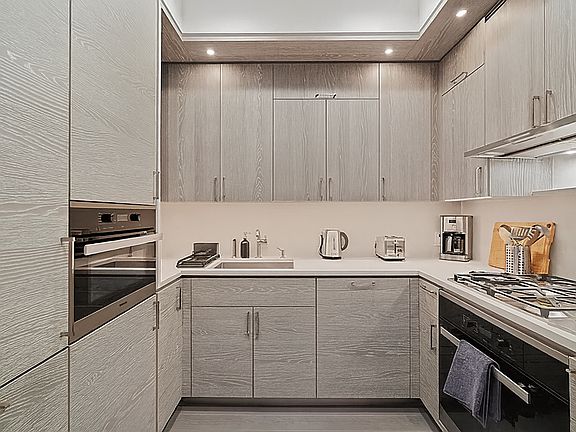 The chef-inspired kitchen includes sleek white quartz countertops, custom oak cabinetry, and top-of-the-line Miele applianceshighlighted by a 5-burner gas range, 36" refrigerator, oven, and speed oven.