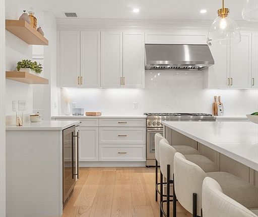 - Features: Flooring - Hardwood, Pantry, Countertops - Stone/Granite/Solid, Kitchen Island, Cabinets - Upgraded, Exterior Access, Open Floorplan, Recessed Lighting, Slider, Stainless Steel Appliances, Wine Chiller, Gas Stove, Lighting - Pendant, Crown Molding