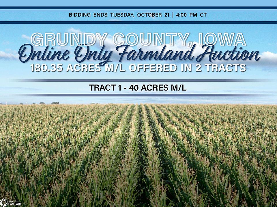 Grundy County, Iowa Online Only Farmland Auction - Bidding is Currently LIVE and will end October 21st, 2025 at 4PM! Tract 1 presents as 40.00 gross acres m/l located in Section 14 of Felix Township in Grundy County, Iowa. The farm contains 38.02 FSA cropland acres m/l carrying an average CSR2 rating of 86.4. This tract carries primary soil types of Tama silty clay loam and Dinsdale silty clay loam, with the cropland acres classified as HEL (Highly Erodible Land). This tract has excellent paved access from County Highway D65 and lies in close proximity to State Highway 14, allowing for excellent grain marketing opportunities. The farm lease for Tract 1 is open for the 2026 crop year.