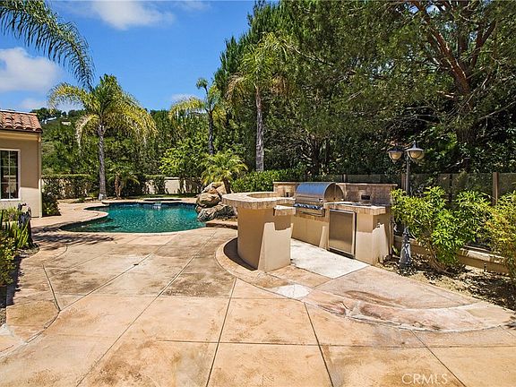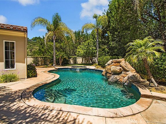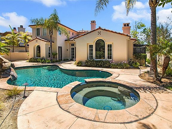 Stunning pool home in prestigious guard-gated Coastal Canyon is now available for lease. End of cus-de-sac location offers the ultimate in privacy and solitude for this lovely Mediterranean residence. Dramatic two story foyer opens up to a beautiful wood paneled library/living area with fireplace, wine fridge and french doors to the outside. The elegant formal dining room is adjacent to the gourmet kitchen with Viking appliances, Sub-Zero fridge, dark wood cabinetry, granite countertops and breakfast bar. Kitchen is open to the large family room with fireplace, built-ins and door to the backyard. The Primary Suite is located on the main floor, with a large walk-in closet with built-ins, spa-like bath with walk-in shower and soaking tub. Also on the main floor is a wood-paneled office nook, ensuite guest room and powder room. Travertine flooring throughout the living area. Upstairs you'll find a balcony with peek-a-boo ocean view, media or play area, and two additional ensuite bedrooms. Fabulous entertaining awaits in the backyard with pool, spa and waterfall, built-in BBQ and bar area. Plenty of space for casual gatherings. The community offers a park at the end of the street, association pool and spa. You will love being close to the coast, near hiking trails and the beach!