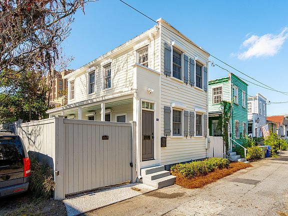 This charming two bedroom, two-and-a-half bath home has been meticulously updated and is situated in downtown Charleston. You will be greeted by a full front porch and an open floor plan with abundant natural light. The kitchen features stainless appliances, quartz countertops and beautiful pendant lights. There is also a spacious living and dining area, and the home showcases original circa 1885 heart pine floors throughout. A powder room and a laundry area complete this level. The second floor has two bedrooms with updated en suite bathrooms. Outside, the backyard is the perfect place for a morning cup of coffee. There is a free-standing shed for convenient storage plus a storage system for two bicycles. The brick trimmed custom driveway can accommodate up to three vehicles. Extensive improvements and updates have been made by the current owner including a new privacy fence with remote control driveway gate, remote control hurricane shutters on all windows, and new all-weather exterior doors, frames, transom, hardware and locks. There is a whole house water pressure boost pump system, and new showerheads and hand-held fixtures. Security cameras with lights were installed, two-way voice communication, video storage capability and remote viewing and access. The electric panel was replaced and upgraded with a whole house surge protector. 1 Ducs Court is conveniently located in a X flood zone just a short walk from the upper King Street corridor. This area blends historic charm with a vibrant, creative food scene with many restaurants like Xiao Bao Biscuit, Chez Nous and Chubby Fish less than a mile away.