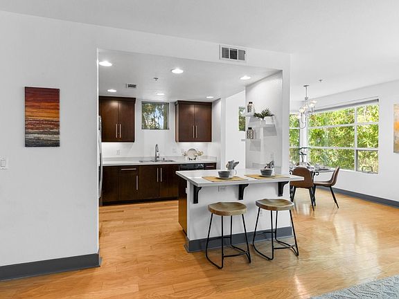 Gorgeous townhouse-style home for sale in the One East community in Downtown San Jose. You will love the sleek and elegant lines that accentuate this home. Spacious 1,352 square feet of living space with main living area downstairs and bedrooms upstairs. The property features hardwood floors on the main level with an open kitchen, spacious living room, and dining area. The kitchen includes a large island, stainless steel appliances, and beautiful quartz counters. There are two master bedrooms suites upstairs each with their own private en suite bathroom, and each bedroom has plenty of closet space. This is a corner unit with no one above or below. There is abundant natural sunlight in this corner unit with the extra windows. The tall ceilings and open spaces make this home feel even larger and brighter. Includes 2 single stall parking spaces in secured garage. Great location in Downtown San Jose walking distance to San Pedro Square, restaurants, theaters and entertainment. Easy freeway access to 87, 101, 880 and 280. Don't miss out!