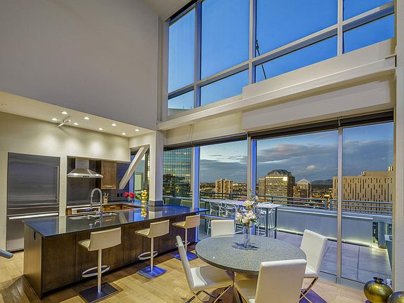 Soaring ceilings and walls of glass capture the most astounding views of downtown, the Preserve & Camelback Mountain from the corner Penthouse unit on the 16th floor of One Lexington. North/eastern views create well-balanced light that cascades through the retractable glass doors that lead to the wrap around balcony with ample shade and privacy. Dual primary suites on both the main and upper level with spacious bathrooms and an open loft create a living space that is sophisticated with endless flexibility. Wood floors span the main level below- while industrial elements above create a modern urban living space that is simply unmatchable. Stainless steel appliances and custom cabinetry adorn the chef's kitchen that is open to the family room for endless views of the city lights the the surrounding mountaintops. One Lexington Amenities include: On site security, concierge services, a large resort style pool and Spa, outdoor cabanas, fitness center, yoga and two lounges. Ride the light rail, visit Park Central, explore downtown or enjoy a game- all within minutes of this extraordinary penthouse.