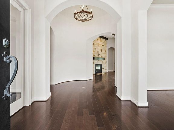 Massive double doors open wide, extending a warm welcome into this stunning custom home. The floor plan flows from one beautiful space to the next. Rich wood flooring extends throughout most of the first level, complemented by high ceilings, expansive windows, and tall 8-foot solid wood doors that enhance this home. The main level features two spacious bedrooms and 2.5 bathrooms, along with a formal dining room, bright breakfast area, private study, and a cozy yet spacious family room. The gourmet kitchen is outfitted with granite countertops, double ovens, a wine bar with refrigerator, and space to entertain. Upstairs, enjoy movies in the game room located near two additional bedrooms and one full bath. Step outside for some backyard entertainment with a stacked-stone pool, outdoor kitchen, fireplace and fire pit, or catch the big game from the covered patio equipped with TV, perfect for any sports enthusiast. The three-bay tandem garage provides ample storage and parking.