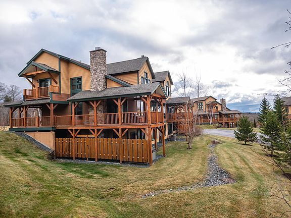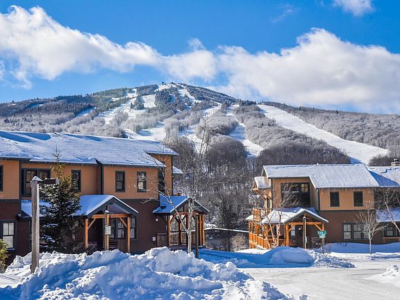 Stunning direct Mount Snow from this spectacular Outlook Townhome just up from the base area at the Mount Snow Ski Resort. This 5 bedroom, 4 bath townhome features rustic natural wood finishes throughout, great natural light, numerous windows, and a rustic charm befitting a luxury ski residence. At the exterior you are greeted by a timber style covered porch that wraps around to the rear with exposure to the westerly and southerly views directly over the ski trails and mountains beyond. Inside you'll find a spacious open living, dining, and kitchen areas, including a vaulted great room with floor to ceiling stone fireplace, soapstone counters in the custom kitchen with stainless appliances and gas range, wood floors, 2 vaulted suites upstairs including a primary with amazing views, a main floor suite, lower level family room with gas fireplace with stone surround, large bunk room, another cozy guest room, spacious laundry area which leads into the amazing owner gear closet, large mudroom entries with cubbies and coat closet, and an outdoor hot tub to take in the views. The unit also features air conditioning, shuttle service to and from the mountain, and beautiful year round maintenance and landscaping.