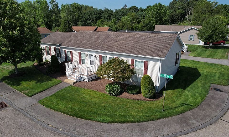Beautiful double-wide ranch in the private Skyview Village is move-in ready! A charming front porch welcomes you into a bright, open-concept living room. The eat-in kitchen offers gas cooking, a stainless steel double sink, oak cabinetry, abundant storage, and a slider leading to the back deck—perfect for morning coffee or evening relaxation. The main bedroom is your own retreat, featuring two walk-in closets and a private bath with a 5-ft walk-in shower. An attached garage keeps your vehicle protected from the elements, while the desirable corner lot adds extra privacy and convenience. Ideally located just minutes from Route 28, Brockton Country Club, and more! Call today for a private showing!