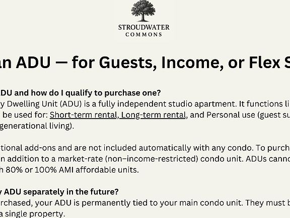 Welcome to Stroudwater Commons — Portland's newest condo community, where modern design meets attainable luxury. With bright, open spaces, timeless finishes, and exceptional efficiency, these 2BR/1BA homes are thoughtfully crafted for both comfort and convenience. Each residence offers a spacious layout, sleek modern kitchen, stylish bath, in-unit laundry, and efficient heat pumps for year-round comfort, complemented by elevator access to all levels. Parking is available for purchase at a very reasonable rate—$5,000 for the first space and $10,000 for a second (subject to availability). Residents also enjoy access to curated community amenities including a fitness center, co-working lounge, bike storage, EV charging provisions, and direct access to Portland Trails. For added flexibility, buyers have the unique opportunity to purchase a detached ADU- a fully independent studio apartment ideal for short-term (Airbnb) or long-term rental income, a guest suite, or multigenerational living. The convenient Congress Street location keeps you close to everything: downtown Portland, I-295, I-95, Stroudwater Park, Fore River, USM, Rock Row, and the Jetport are all within easy reach. With no income restrictions, these homes present a rare opportunity to own brand-new construction in one of Portland's most connected neighborhoods. Now available for reservations. Estimated occupancy: Fall 2026. HOA fee is estimated. Photos depict a projected look; finishes and specifications are subject to change. Taxes are estimated using the mill rate at the time of listing, based on the listing price. Final taxes will be assessed after completion and are provided for budgeting purposes only. Visit the Stroudwater Commons website for more information.