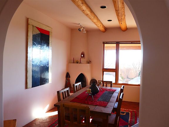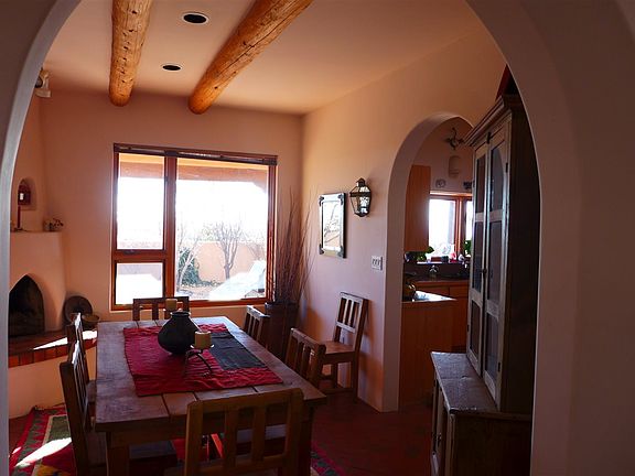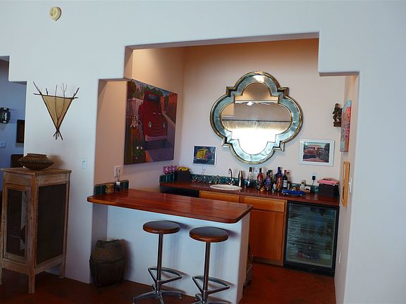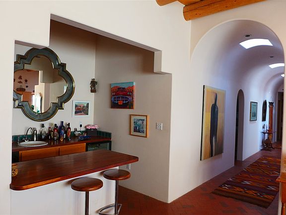 BEAUTIFULLY maintained Leif Backe last model home and his personal residence. Very private feeling with a close in to the Eldorado entrance and amenities. Home is passive solar, very open with lots of light and well thought out single level floor plan. 3 bedrooms, plus office/4th bedroom. Wet bar in living room is perfect for entertaining. Arched doors are custom built, Lovely landscaped walled yard with Portal, mature trees and a dog run with old growth tree for shade. Retractable sun/wind shade on west side portal. Oversized 3 car garage with built in shelving.
