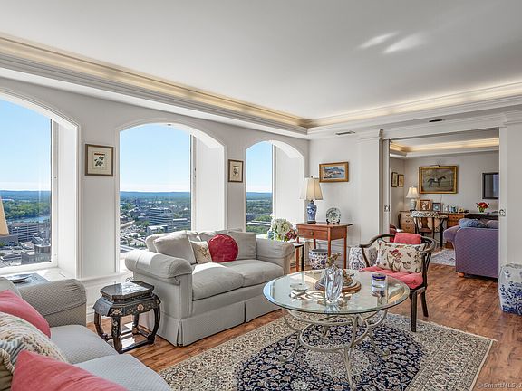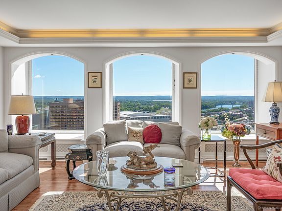 Spectacular views of the Ct. River from this 25th floor unit with one bedroom, two baths, living room, dining room and den. Beautiful custom arched windows with remote controlled shades, beautiful tray ceilings, sound system, kitchen with park view. Parking in underground garage for one car. 24hr security/concierge. Special assessment- $222.65 through 12/35. Cable/internet-$97/month. Condo fee on parking space#104-$70.81/month, Tax on parking space-$410.53. Professional photos to come