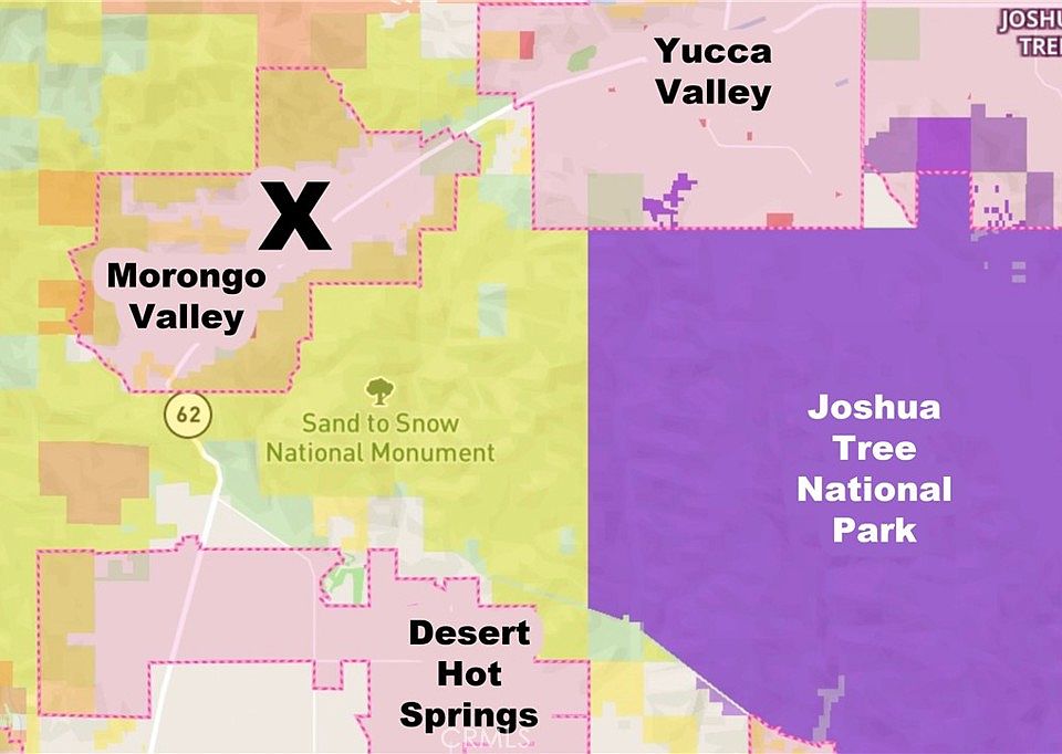Flat two acres in a convenient location just 300 ft off of paved Hwy 62. Easy commute to the resort area of Palm Springs, the city of Riverside, and Joshua Tree. Electricity is available. Zoning is RL Rural Living, which allows for a tiny home on a permanent foundation, a single-family home, or a manufactured home. Mountain views!