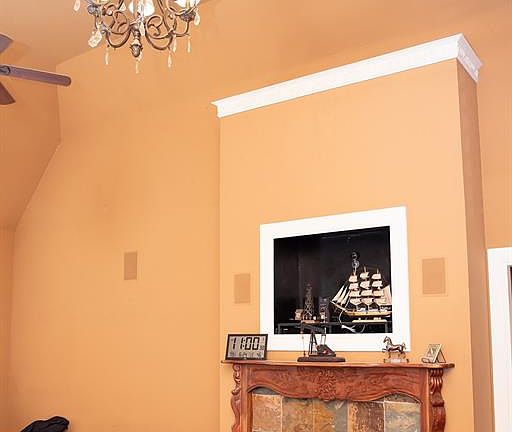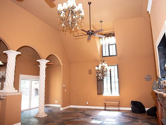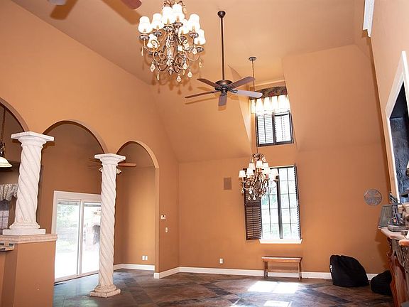 This bedroom/2 bath home has 2,189 sq. ft. of living space. The property sits on a 0.5-acre lot. The kitchen comes with granite countertops, wooden cabinets, a center island, and marble tile flooring. The living room has high ceilings, a chandelier, a ceiling fan, a fireplace, and same marble tile floors. The primary bedroom has a walk-in closet, and the bathroom features double sinks and cabinet storage. A glass sliding door opens up to the backyard.