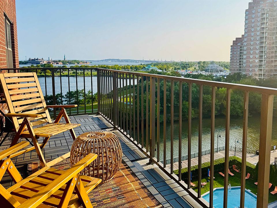 Almost 1500sf of luxury living at Clermont Cove, one of Paulus Hook's most exclusive doorman buildings. This spacious, recently renovated home features two bedrooms plus a large den, two full baths, a large dining living area, plenty of closet space, and a huge private terrace with serene views of the Statue of Liberty, New York Harbor, and Liberty State Park. This sun-filled space boasts an open style kitchen with granite countertops, custom cabinetry, S S appliances and tasteful upgrades including a wine refrigerator and minibar. The terrace can be accessed through the living room and both bedrooms. The extra room is currently being used an office/huge primary bedroom suite, but was previously used as a 3rd Bedroom, and can easily be converted back. Approved architectural plans are included. One valet garage parking space is included in the maintenance fee. Clermont Cove is a full service, luxury building full of amenities including swimming pool, gym, BBQ area, Sky lounge with amazing NYC views, laundry room, and 24 7 concierge. One of the best locations in Paulus Hook - surrounded by parks, nature, restaurants, and shopping, PS 16 school district, with easy access to NYC via Ferry or Exchange Place PATH just minutes away. Whole Foods a quick 7min walk.