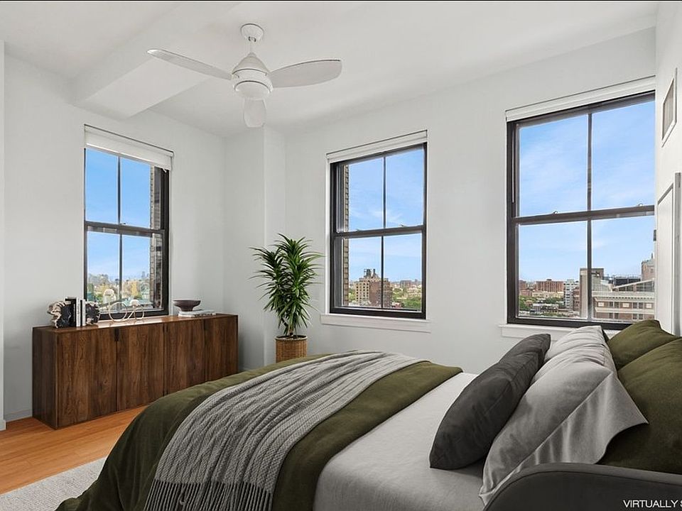 The king-sized primary suite is a quiet sanctuary, offering three oversized windows—one framing a postcard-worthy view of the Midtown Manhattan skyline. The suite includes an oversized walk-in dressing room, as well as a private ante room currently used as a cozy den. Two additional bedrooms are generously sized, while thoughtful upgrades throughout include custom storage, soundproof CityQuiet windows with remote activated shades, central HVAC (no clunky PTACs), an in-unit washer/dryer, and an oversized deeded storage unit.