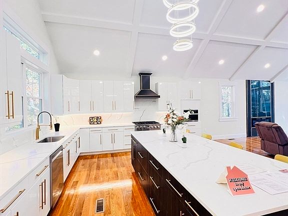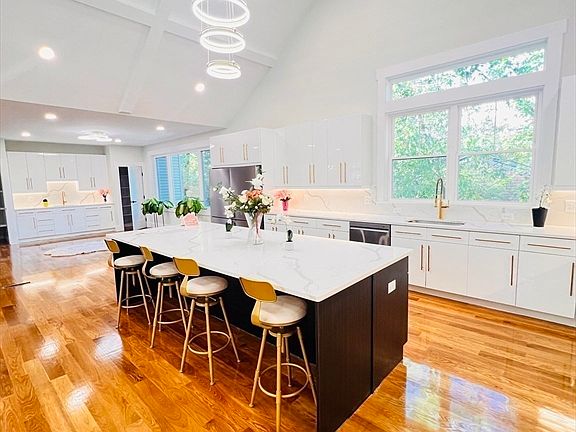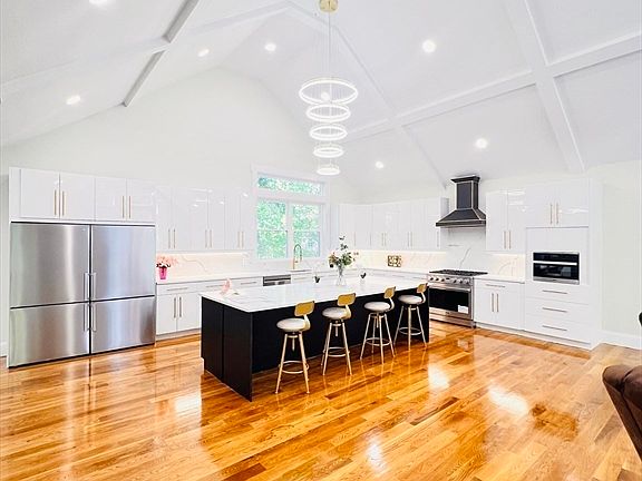 Discover luxury in this newly built Modern Colonial on a prime corner lot, boasting 6,700 sq ft of refined living space across 3 levels with an open-concept flow. Recently refinished floors add timeless elegance. First Floor Highlights: Expansive 24x24 family room with fireplace, formal dining, breakfast nook, wet bar, pantry, and large study with fireplace. Cathedral ceilings soar over a gourmet kitchen featuring high-end THOR gas range, dual BERTAZZONI refrigerators, MIELE speed oven/microwave, ZLINE custom hood, sleek white custom cabinets, quartz counters, a massive 51"x123" island. Includes a 18x20 primary bedroom suite and full bath. Second Floor: 4 oversized bedrooms, 3 full baths, walk-in closets, and convenient laundry. Natural gas FHA heating with 3 zones ensures comfort. Lower Level: Walk-out basement with kitchenette, full bath, and 24x38 four-car garage featuring 2 large finished bonus rooms. Maximum 400-amp service, EV charger, and natural gas. Unparalleled at this price.